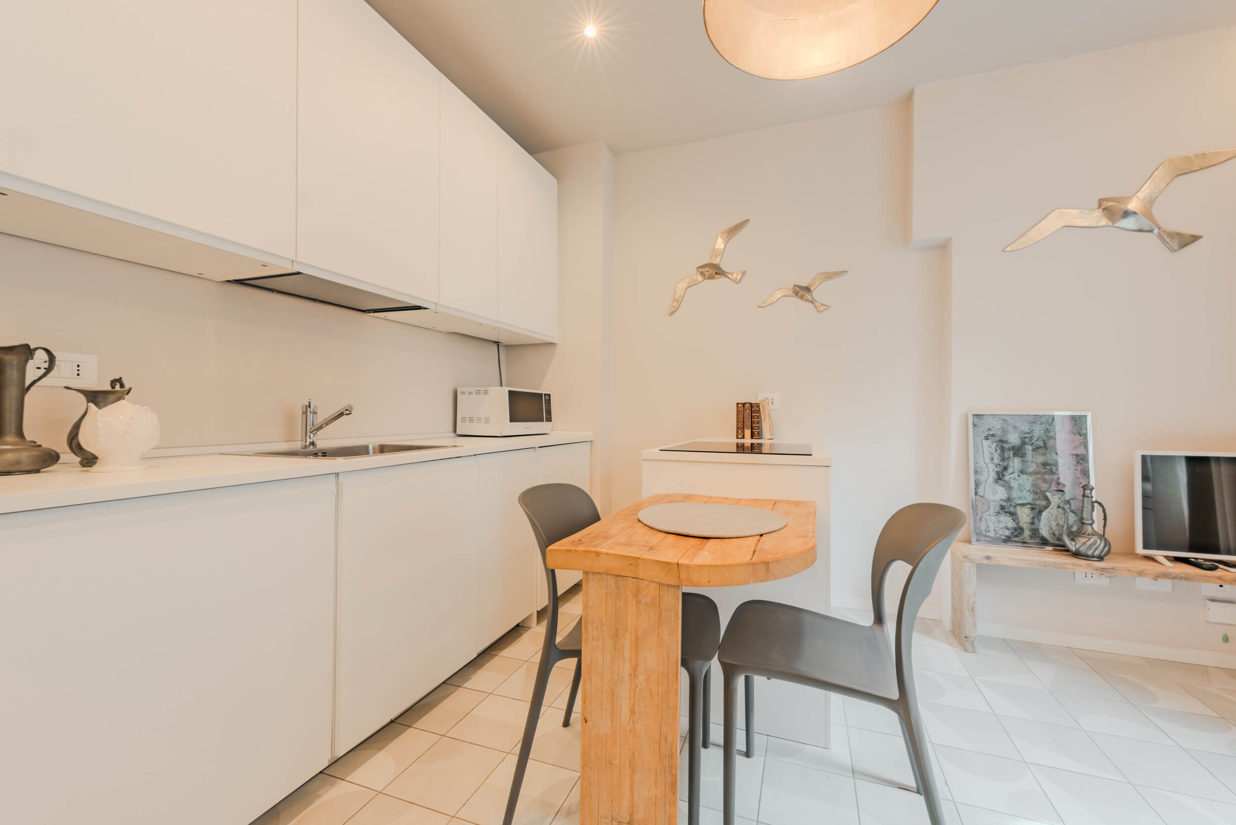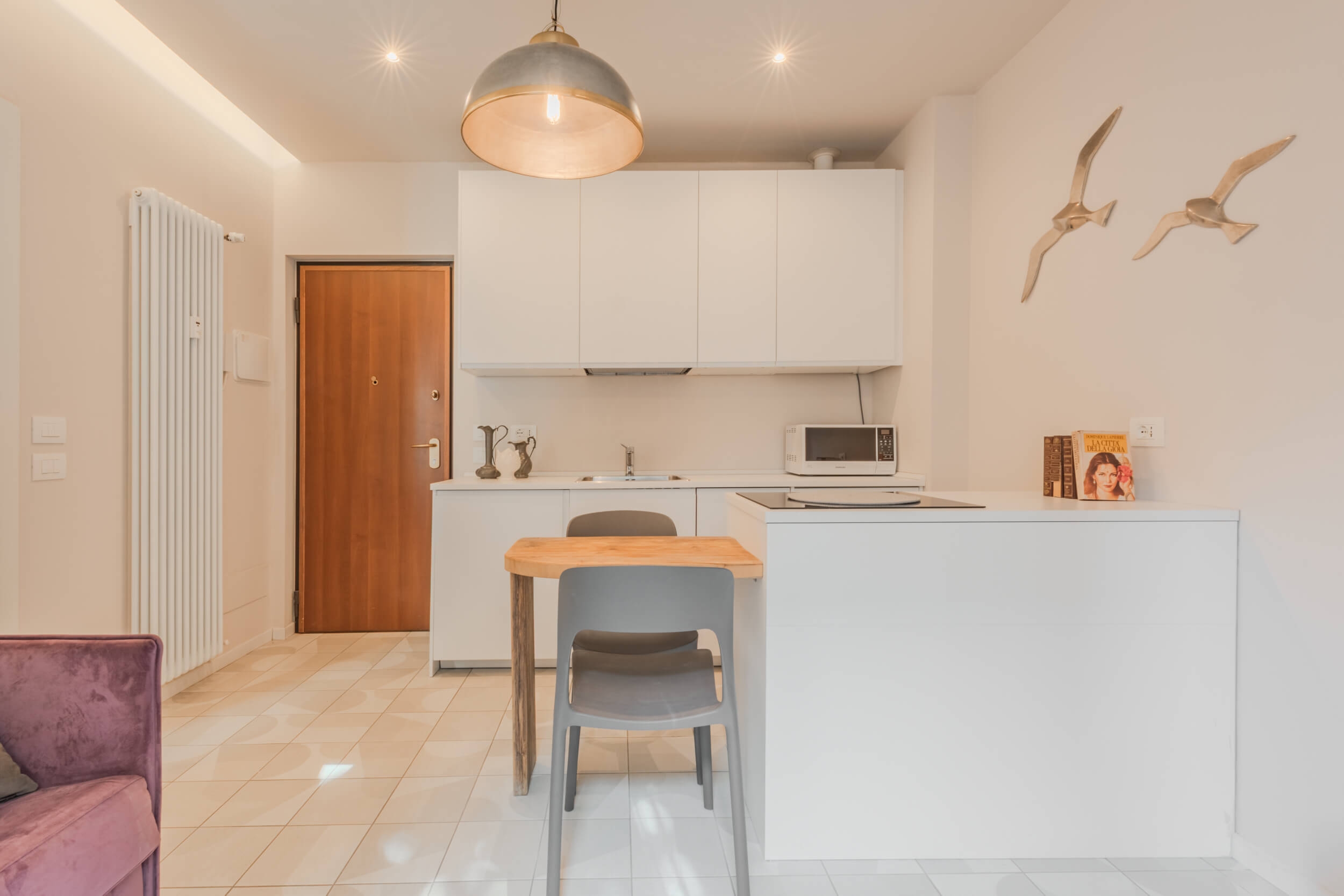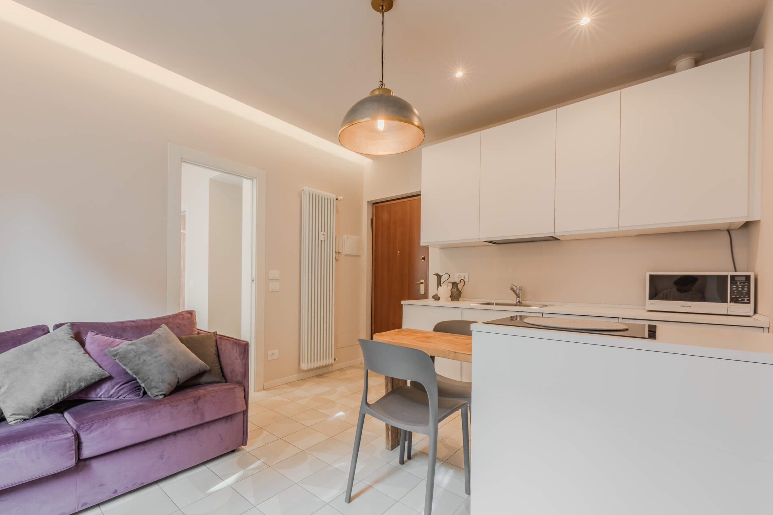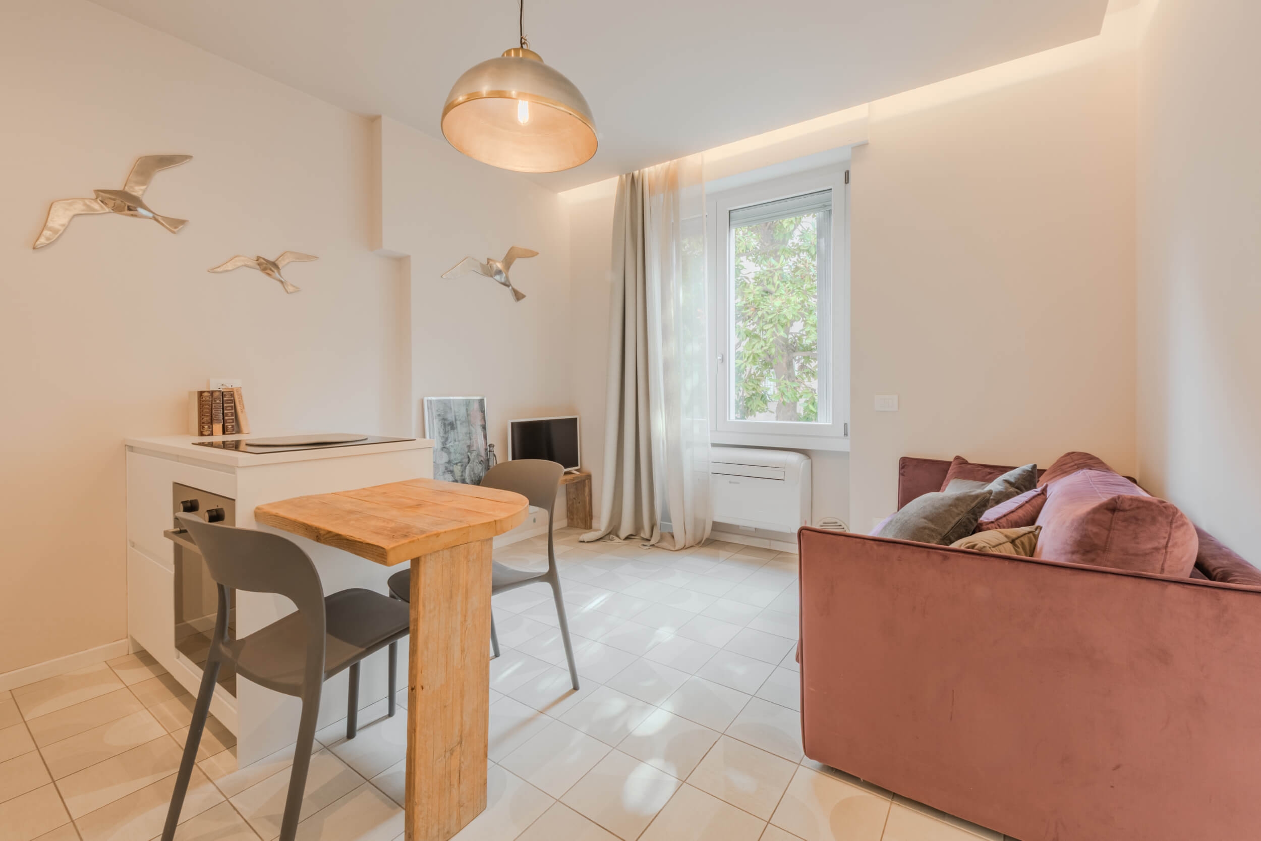 Pensato per offrire il massimo del comfort abitativo con uno stile moderno e funzionale, l’immobile presenta affaccio sul cortile condominiale interno e una luminosità naturale costante. L’ingresso si apre su un living con cucina a vista con isola e divano a letto su misura, ideale per vivere e ricevere in un ambiente accogliente e di tendenza. La camera da letto è dotata di letto matrimoniale e armadio specchiato per ottimizzare gli spazi con eleganza. Il bagno, curato nei dettagli, presenta un ampio box doccia walk-in, lavabo di design, sanitari sospesi.
